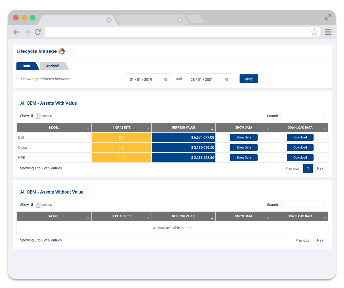Select a data range and IngenewIT™ will deliver the estimated cost to refresh assets based on the original acquisition cost per OEM. It also includes all warranty and EOS/EOSL data.