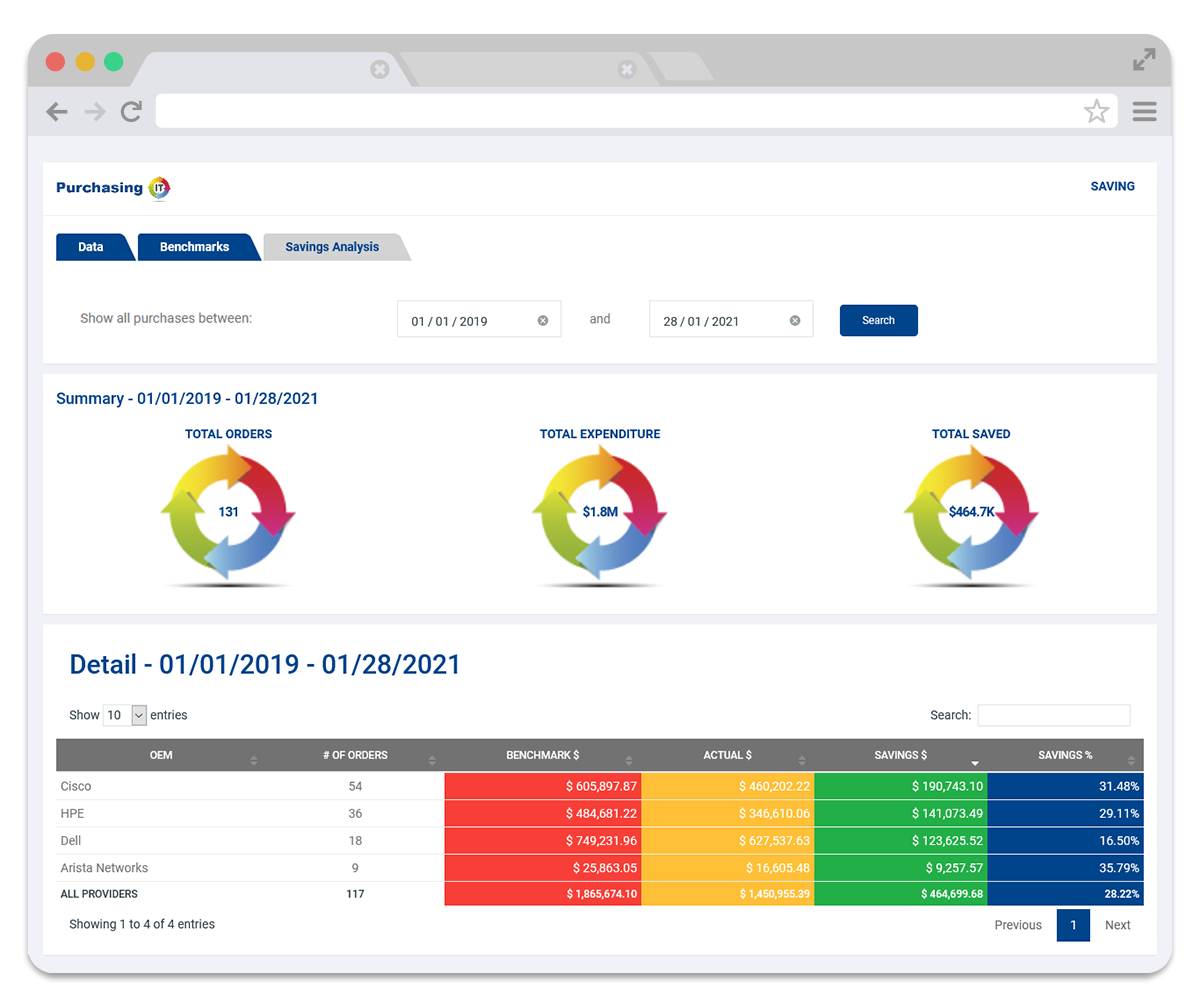 Select a data range and IngenewIT™ will deliver the savings generated on the procurement of assets based on benchmark data from previous purchases. It is probably the most exciting module within IngenewIT™ and is used by VARs and Customers in many unique ways.